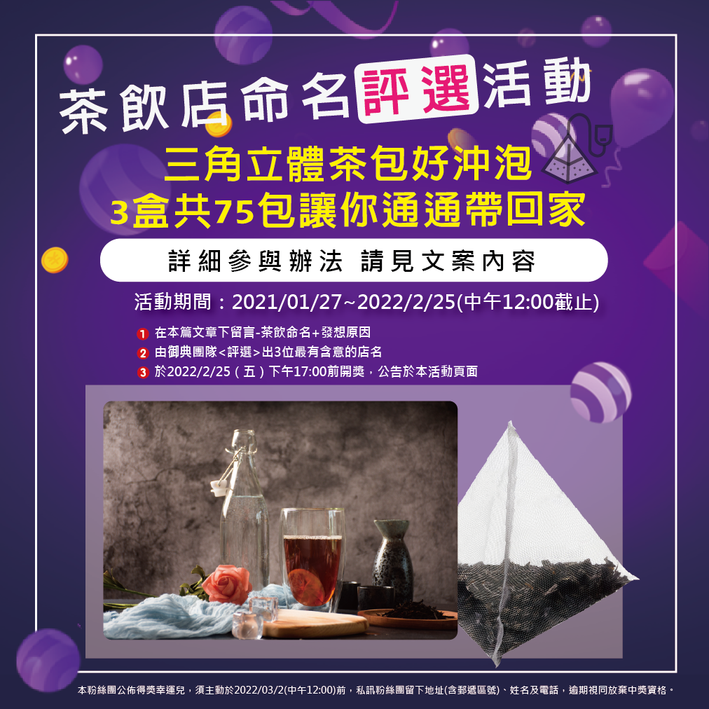 登入Facebook帳號在此篇文章下,留下你覺得符合上述目標客群的<茶飲店名稱+發想原因>,就有機會抽到<三角茶包-辦公室茶包(立體茶包)3盒/共75包 >