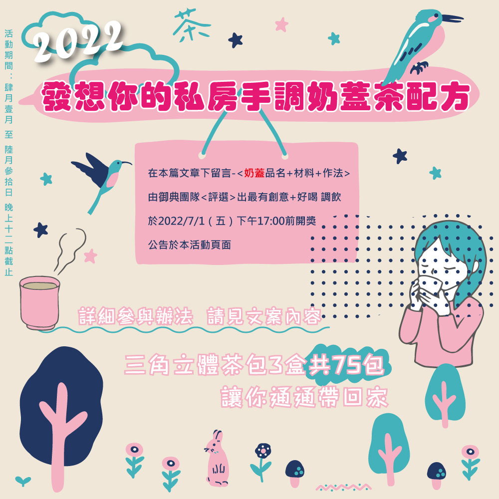 05. 得獎資格:在<御典天之茶>團隊-發想你的私房手調奶蓋茶配方貼文底下,參與<留言-奶蓋品名-材料-作法>活動對象,將由御典團隊<評選>出6位最獨特的奶蓋茶配方,贈三角茶包-辦公室茶包(立體茶包)3盒/共75包(不挑口味,隨機發送)