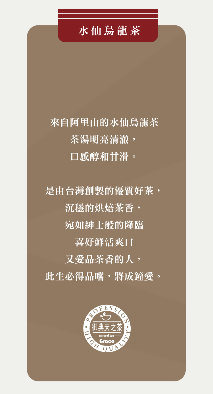 特色:中焙火、氣香沉穩、味甘爽、醇厚溫潤性 -